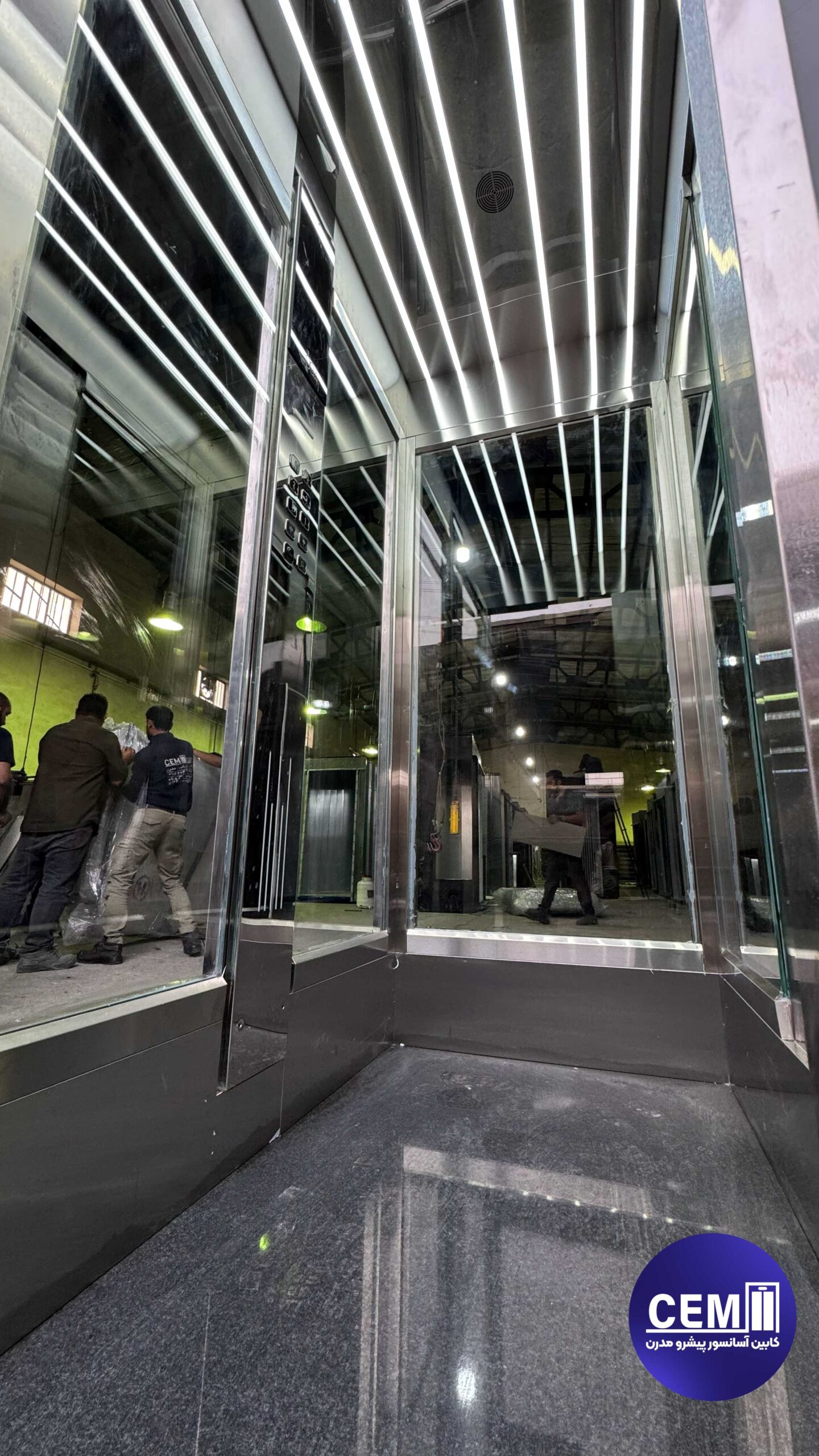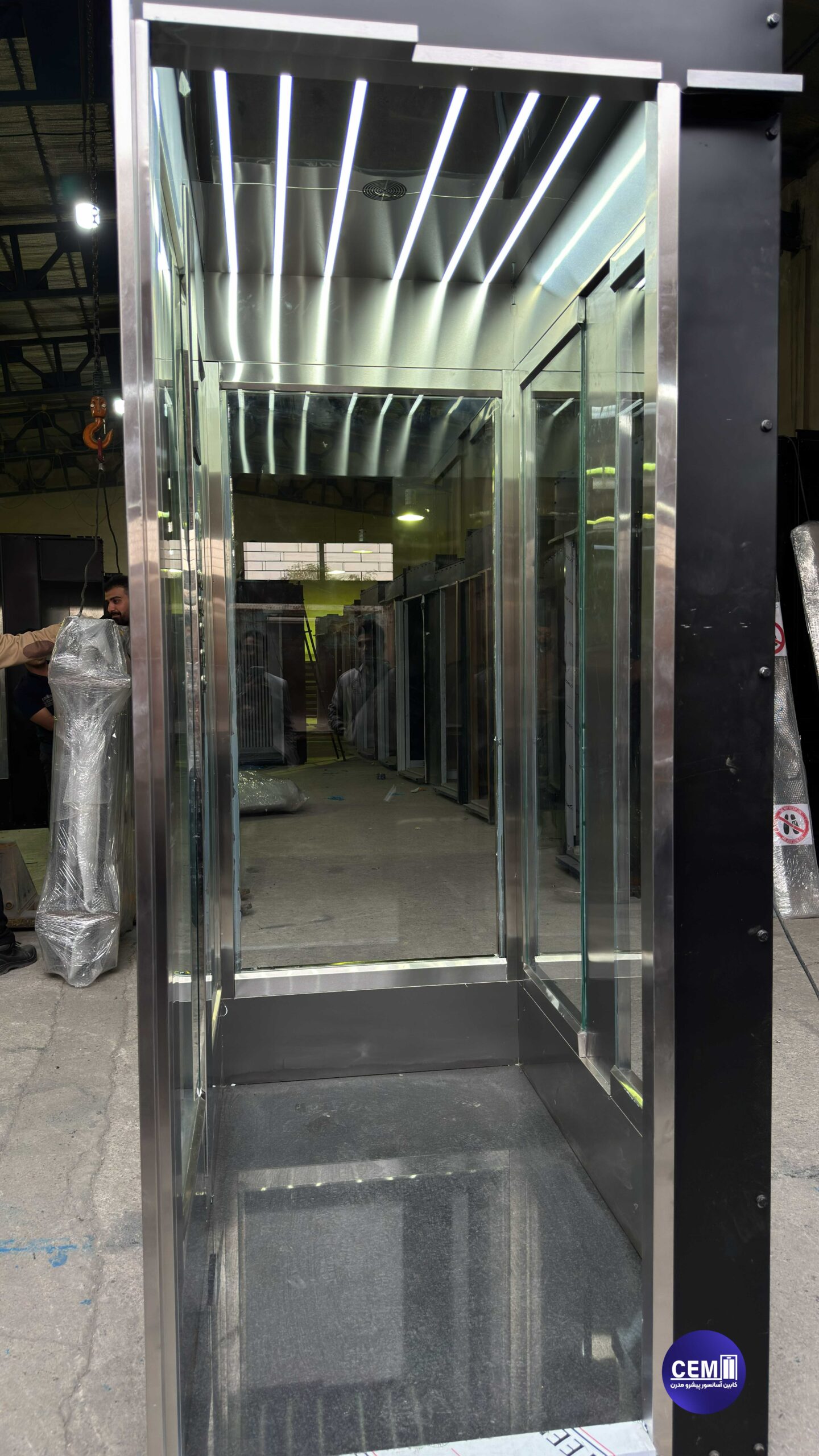 نورپردازی LED خطی در سقف باعث میشود کابین در هر شرایط نوری، روشن و چشمنواز باشد. این نورها بهطور یکنواخت پخش میشوند و بهصورت هدفمند، متریال شیشه و استیل را برجسته میکنند.